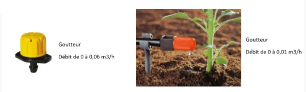 - Les goutteurs ont des débits de 10 à 60 litres/h (0,06m3/h).
