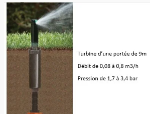 - Les turbines et arroseurs de jardin ont des débits de 1 à 13 l/mn (0,1 à 0,8m3/h).